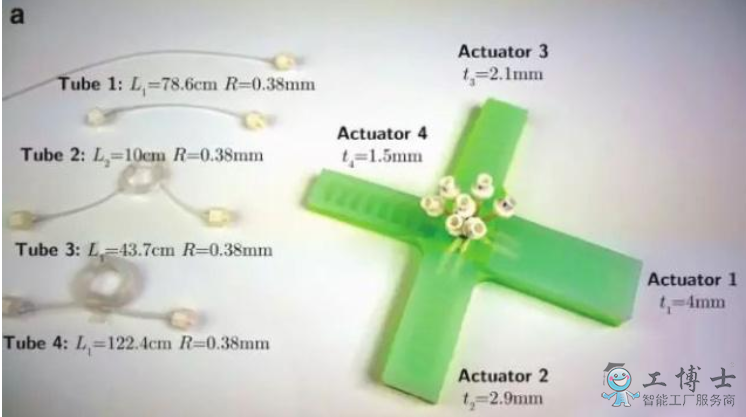 該方法通過(guò)使用不同直徑的管子來(lái)控制空氣在軟體機(jī)器人裝置中的移動(dòng)速度,即一次性通過(guò)其中一個(gè)管泵輸送相同數(shù)量的空氣,管的大小將決定空氣流動(dòng)的方式和位置。