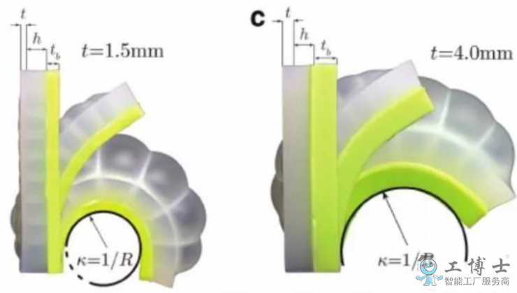 此外,由于每個(gè)執(zhí)行器的大小、厚度不盡相同,在輸入等量空氣時(shí),彎曲的程度也不同,因此運(yùn)動(dòng)的距離也會(huì)有所差別。
