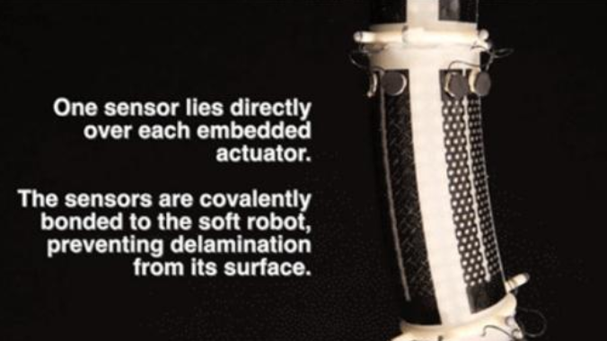 研究人員設(shè)計(jì)的機(jī)器人軀干包括三個(gè)部分,每個(gè)部分帶有四個(gè)用于移動(dòng)手臂的流體致動(dòng)器(總共12個(gè))。他們?cè)诿總€(gè)段上融合了一個(gè)傳感器,每個(gè)傳感器覆蓋并收集了來自軟機(jī)器人中一個(gè)嵌入式執(zhí)行器的數(shù)據(jù)。他們使用了“等離子鍵合”技術(shù),該技術(shù)可以使一種材料的表面通電,使其與另一種材料鍵合。大約需要幾個(gè)小時(shí)才能成型出數(shù)十個(gè)傳感器,這些傳感器可以使用手持式等離子結(jié)合設(shè)備結(jié)合到軟機(jī)器人上。