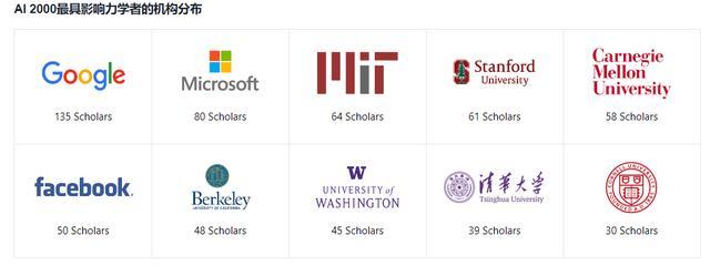 在AI 2000榜單上榜學者的機構分布中,清華大學仍為top10中唯一的國內機構。前十大機構分別為谷歌、微軟、麻省理工學院、斯坦福大學、卡耐基梅隆大學、Facebook、加州大學伯克利分校、華盛頓大學、清華大學和康奈爾大學。