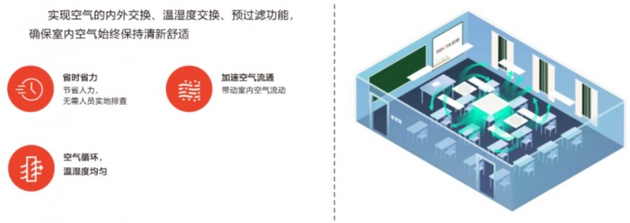 智慧空氣環境系統通過實時監測室內外各項環境指標,智能調節新風、空調、風扇等設備,促進室內外空氣過濾交換、溫濕度交換以及室內空氣流動,不斷輸出新鮮空氣、排出有害物質,為師生營造健康的空氣環境,同時提高學生學習績效。