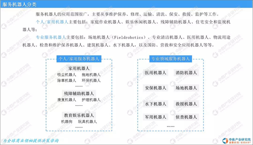 服務(wù)機(jī)器人的應(yīng)用范圍很廣,主要從事維護(hù)保養(yǎng)、修理、運(yùn)輸、清洗、保安、救援、監(jiān)護(hù)等工作,可以分為個人/家用服務(wù)機(jī)器人及專業(yè)領(lǐng)域服務(wù)機(jī)器人。