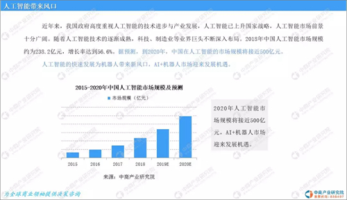 近年來,我國政府高度重視人工智能的技術(shù)進(jìn)步與產(chǎn)業(yè)發(fā)展,人工智能已上升國家戰(zhàn)略,人工智能市場前景十分廣闊。隨著人工智能技術(shù)的逐漸成熟,科技、制造業(yè)等業(yè)界巨頭不斷深入布局。2018年中國人工智能市場規(guī)模約為238.2億元,增長率達(dá)到56.6%。據(jù)預(yù)測,到2020年,中國在人工智能的市場規(guī)模將接近500億元。人工智能的快速發(fā)展為機(jī)器人帶來新風(fēng)口,AI+機(jī)器人市場迎來發(fā)展機(jī)遇。
